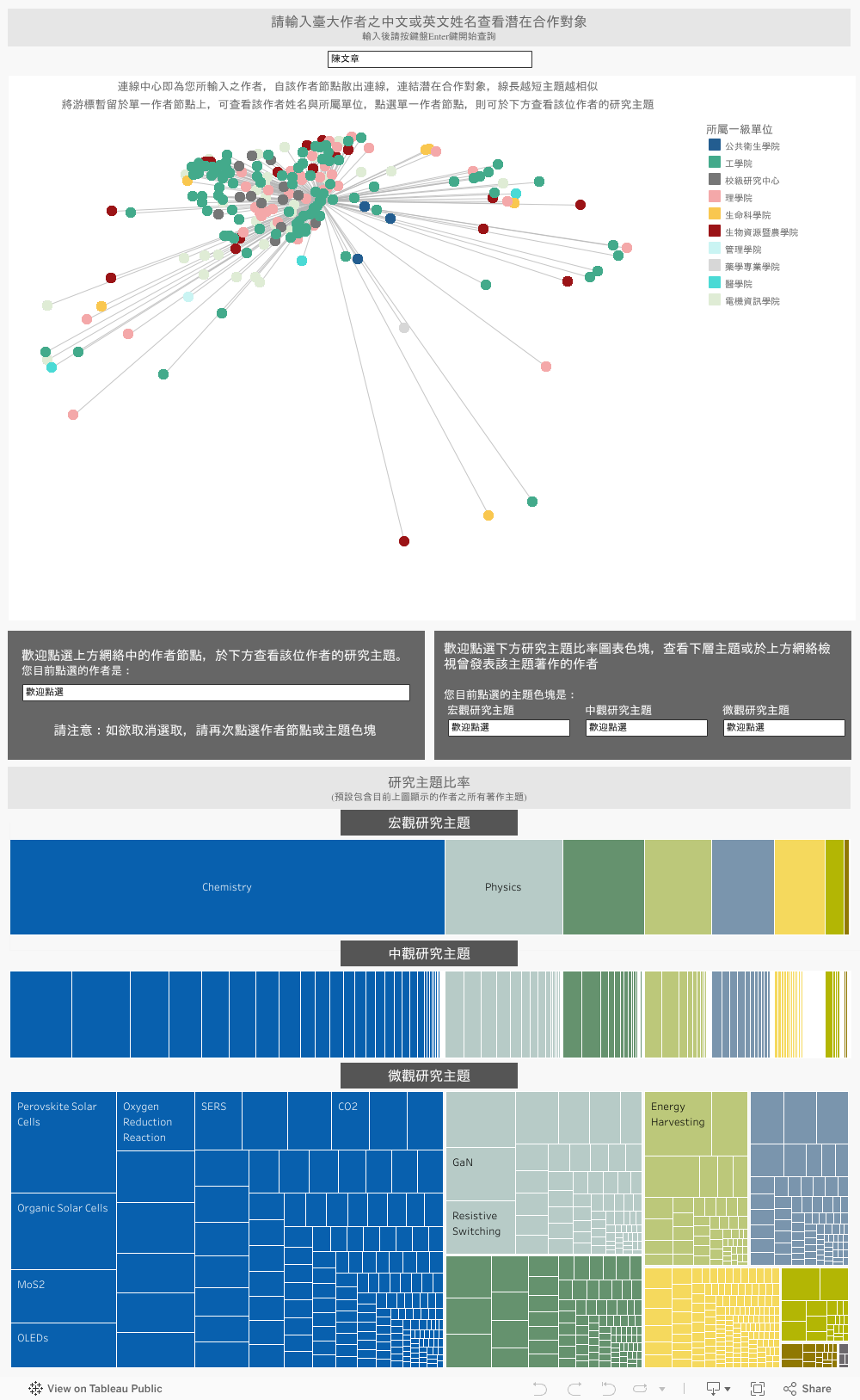 輸入臺大作者姓名,查看臺大潛在合作對象,並可點選作者節點查看單一臺大作者之研究主題比率。本服務分析資料量龐大,載入及運算時間較久,敬請耐心等候。
