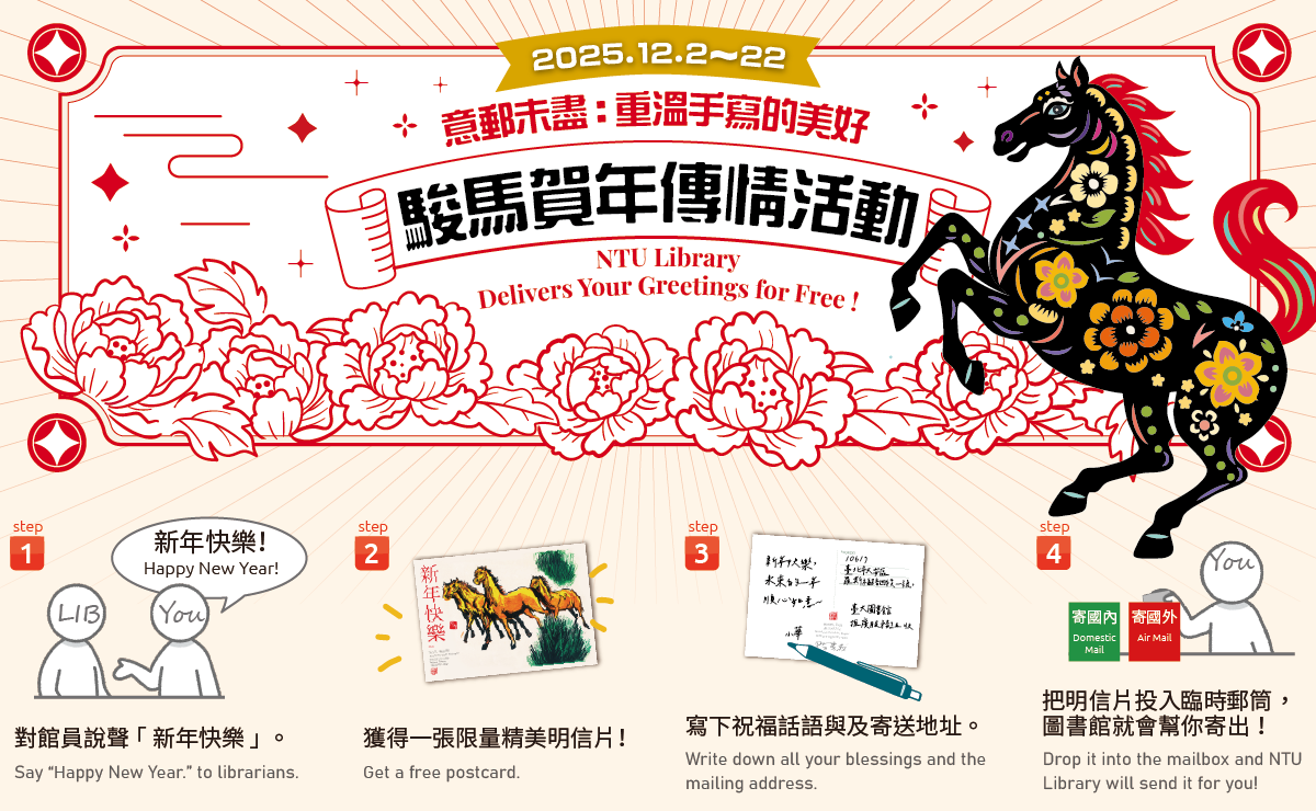 Visit the service desks at the Main Library, Koo Chen-Fu Memorial Library, or Medical Library. Greet our staff with a cheerful “Happy New Year” to receive your special postcard. Write your message, drop it into the event mailbox, and we’ll send it for you — free of charge!